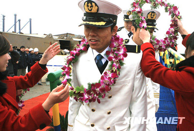 1月23日,人們?yōu)樽呦孪咸莸摹罢袢A4輪”船員戴上花環(huán)。