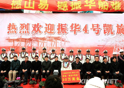 中國日報網(wǎng)環(huán)球在線消息:1月23日,上海振華港機(集團)股份有限公司在上海長興島基地舉行歡迎儀式,迎接“振華4輪”凱旋,對在亞丁灣擊退索馬里海盜襲擊的30名英勇船員進行表彰,并給予30萬美元獎勵。