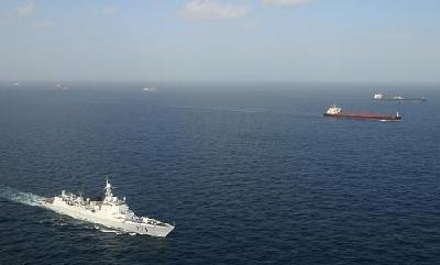 次日,正在執(zhí)行區(qū)域巡邏任務的“??凇迸炓布尤胱o航編組,與“武漢”艦在左右兩側為商船護航。兩艘護航軍艦伴隨護航13艘商船在亞丁灣海域自西向東航行,船隊延綿十余公里,場面蔚為壯觀。