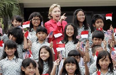 希拉里與到機(jī)場(chǎng)迎接其印尼小學(xué)生合影
