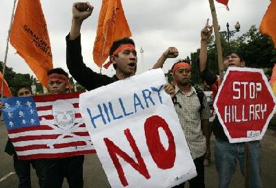 示威者在印尼總統(tǒng)府外抗議希拉里的到訪