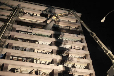 猛虎組織的一架飛機被擊落墜毀在科倫坡市中心的稅務(wù)部大樓上,消防人員正在滅火。