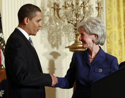 3月2日,奧巴馬提名堪薩斯州女州長凱瑟琳·西貝利厄斯為衛(wèi)生與公眾服務部部長人選。(法國媒體圖片)