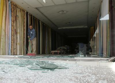 爆炸襲擊結(jié)束后,一名店主正在清掃碎玻璃