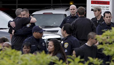 加州州長施瓦辛格當(dāng)天稱21日是悲慘的一天,他發(fā)表聲明稱贊了警官們的奉獻精神:“所有這4名警官不惜犧牲自己的生命保衛(wèi)公共安全,以無私的工作保護奧克蘭市民眾?!敝蓍L辦公室當(dāng)天表示,施瓦辛格22日將從華盛頓飛回奧克蘭,并與當(dāng)?shù)鼐胶褪虚L會面,了解事件的整個過程。