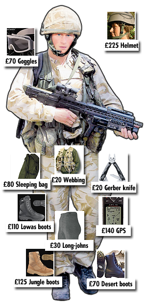 據(jù)報(bào)道,哈里花了225英鎊購買了一個(gè)傘兵頭盔,這比部隊(duì)發(fā)的頭盔要輕便舒適許多。他還買了一個(gè)70英鎊的特別護(hù)目鏡和一個(gè)140英鎊的全球定位系統(tǒng)裝置。