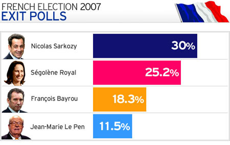 Sofres的統(tǒng)計,在此次大選中被稱為“第三勢力”的中右派“法國民主聯(lián)盟”主席貝魯以18.5%左右得票率居第三名,而極右翼候選人勒龐以11.5%得票率名列第四,未能像2002年一樣闖入第二輪,制造“政治地震”。
