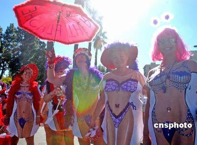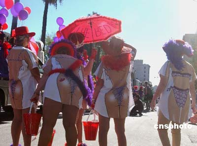 美國加州七月底經(jīng)歷高溫連破歷史紀(jì)錄十二天后降溫。洛杉磯一群開朗快樂的老太太在烈日下?lián)u身一變,搞笑成俏女郎。(賈國榮 攝)