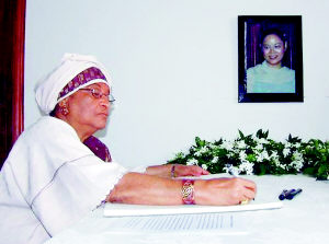 瑟利夫總統(tǒng)在吊唁簿上留言:“今天(30日),我們懷著極其沉痛的心情悼念蔣女士。她來(lái)到利比里亞向利人民傳授竹藤編技術(shù),幫助利人民實(shí)現(xiàn)自給自足,為利國(guó)家和人民做出了奉獻(xiàn)和犧牲。我們惟有確保罪犯受到應(yīng)有的懲罰,才能向她和人民共和國(guó)有所交代。愿她在天之靈得以安息?!?/p>