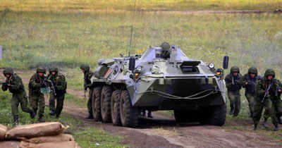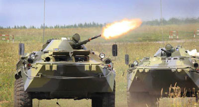 8月6日,在俄羅斯車?yán)镅刨e斯克舉行的實(shí)兵合練中,參演部隊(duì)在裝甲車掩護(hù)下向“恐怖分子”發(fā)起攻擊。參加“和平使命-2007”上海合作組織成員國武裝力量聯(lián)合反恐軍事演習(xí)的各國部隊(duì)當(dāng)日下午在車?yán)镅刨e斯克舉行了首次實(shí)兵合練。新華社記者李剛攝