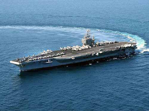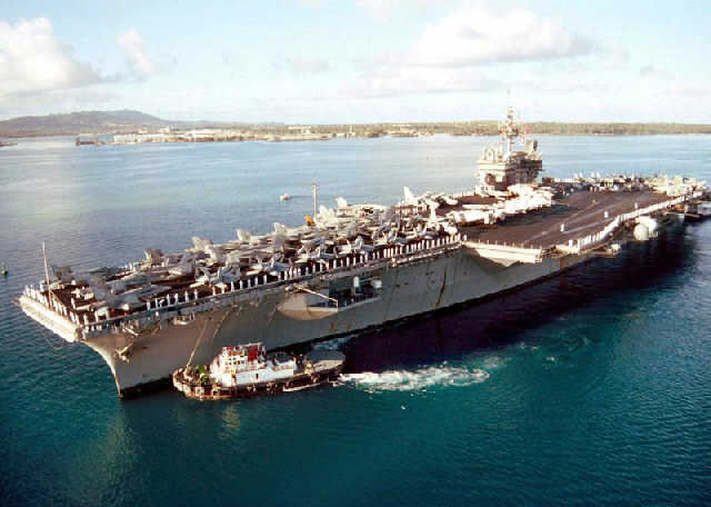 三艘航母分別為“斯坦尼斯”號、“尼米茲”號和“小鷹”號。每艘航母如同一座海上漂浮的軍事基地,可以運載大約70架各型作戰(zhàn)飛機(jī),對周圍幾千公里遠(yuǎn)的目標(biāo)進(jìn)行空襲作戰(zhàn)。其中E-2C可探測周圍幾百公里范圍內(nèi)的作戰(zhàn)飛機(jī)和戰(zhàn)艦,具有隱形功能的F-18E/F戰(zhàn)斗機(jī)可以對半徑1200多公里遠(yuǎn)的目標(biāo)展開突襲。每個航母作戰(zhàn)群均攜帶大量“戰(zhàn)斧”巡航導(dǎo)彈,可對2000公里遠(yuǎn)的戰(zhàn)略目標(biāo)展開攻擊。