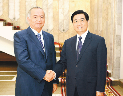 八月十五日,國(guó)家主席胡錦濤在比什凱克會(huì)見烏茲別克斯坦總統(tǒng)卡里莫夫 。
