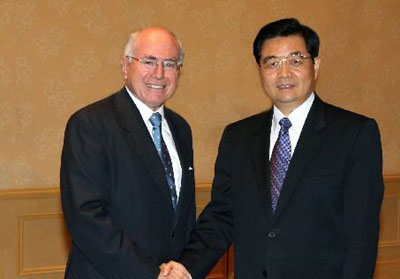 這是2006年11月17日,中國國家主席胡錦濤在越南首都河內會見出席亞太經(jīng)合組織第14次領導人非正式會議的澳大利亞總理霍華德時的照片。新華社記者樊如鈞 攝