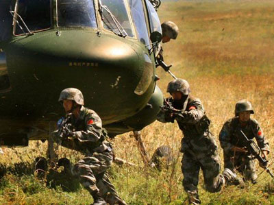 解放軍特戰(zhàn)隊(duì)員機(jī)降到預(yù)定地點(diǎn)展開(kāi)行動(dòng)。新華社記者李剛攝