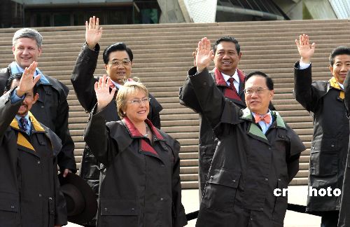 胡錦濤等二十一個(gè)經(jīng)濟(jì)體成員首腦八日集體穿著澳大利亞傳統(tǒng)服裝德瑞莎-波恩揮手致意。在衣服的左上方是二00七APEC的標(biāo)志,由二十一個(gè)元素組成,代表二十一個(gè)經(jīng)濟(jì)體成員。