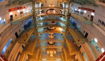 這是載人航天發(fā)射場(chǎng)運(yùn)載火箭和“神舟”飛船垂直測(cè)試廠房內(nèi)景。神舟六號(hào)載人飛船將用長征二號(hào)F型火箭進(jìn)行發(fā)射。
