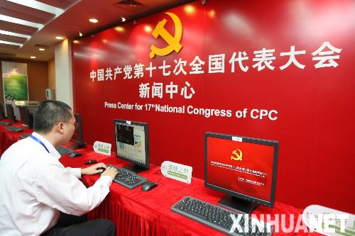 10月6日,一名工作人員在十七大新聞中心內(nèi)對計(jì)算機(jī)進(jìn)行最后測試。