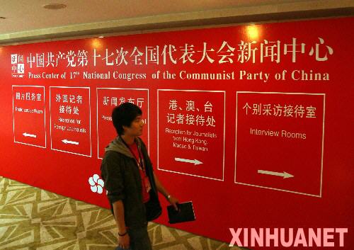 10月6日,一名工作人員從十七大新聞中心內(nèi)的指示牌前走過。 新華社記者李濤攝