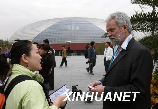10月10日,丹麥政治報記者奧爾森在國家大劇院前接受新華社記者采訪。當日,前來采訪中國共產(chǎn)黨第十七次全國代表大會的40多家境外媒體的120多位記者在北京參觀國家大劇院。新華社記者龐興雷 攝