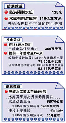 中國(guó)日?qǐng)?bào)網(wǎng)環(huán)球在線消息:揚(yáng)子晚報(bào)2006年10月27日?qǐng)?bào)道,“三峽工程蓄水至156米,將從工程建設(shè)階段轉(zhuǎn)入工程的初期運(yùn)用階段,標(biāo)志著三峽工程已經(jīng)可以全面發(fā)揮防洪、發(fā)電和航運(yùn)等綜合效益?!?/p>