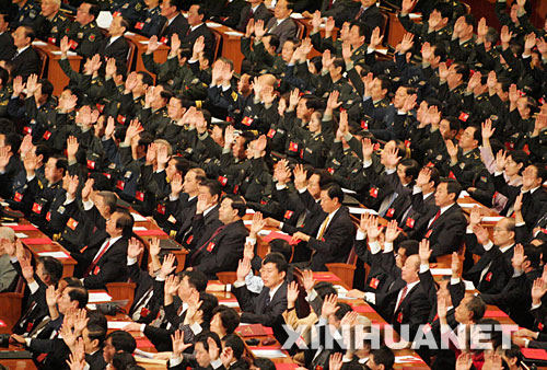 10月21日,中國共產(chǎn)黨第十七次全國代表大會在北京人民大會堂勝利閉幕。這是代表舉手表決。