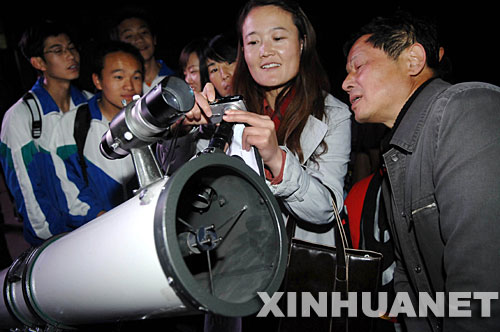 10月24日,天文愛好者正在通過天文望遠(yuǎn)鏡觀看月亮。當(dāng)晚,銀川科技館舉辦“翹首送嫦娥金秋覽月”天文科普活動(dòng),吸引了眾多市民前來觀月,分享我國首顆探月衛(wèi)星嫦娥一號(hào)成功發(fā)射的喜悅。新華社記者 李紫恒 攝