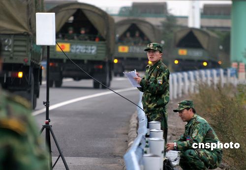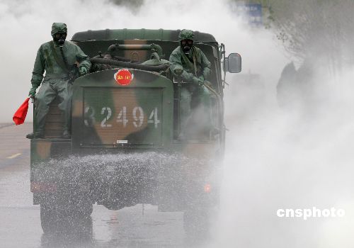 部隊機(jī)動途中道路消毒。10月28日,鐵拳-2007機(jī)步師實兵檢驗性演習(xí)部隊在機(jī)動途中展開防持久毒劑襲擊,化學(xué)偵察,道路消毒,裝備消毒,人員消毒等科目演練。中新社發(fā)曾憲平 攝