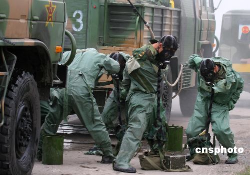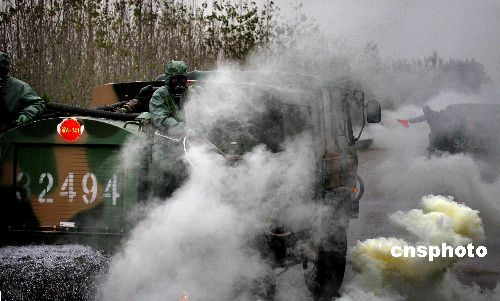 展開防化學武器襲擊科目訓練。10月28日,鐵拳-2007機步師實兵檢驗性演習部隊在機動途中展開防持久毒劑襲擊,化學偵察,道路消毒,裝備消毒,人員消毒等科目演練。中新社發(fā)曾憲平 攝