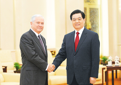 中國(guó)日?qǐng)?bào)網(wǎng)環(huán)球在線消息:國(guó)家主席、中央軍委主席胡錦濤11月6日上午在人民大會(huì)堂會(huì)見(jiàn)了美國(guó)國(guó)防部長(zhǎng)蓋茨。