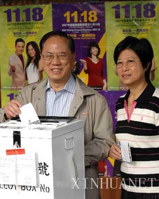 11月18日,香港特區(qū)第三屆區(qū)議會(huì)選舉開(kāi)始投票。香港特區(qū)行政長(zhǎng)官曾蔭權(quán)上午9時(shí)許在投票站投下自己的一票。 新華社記者 呂小煒攝