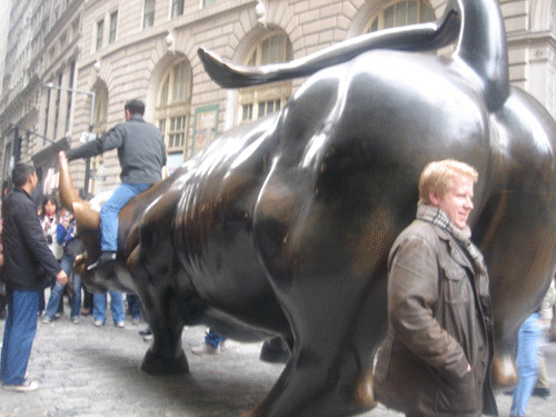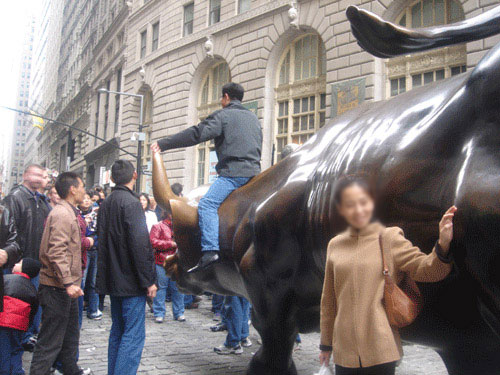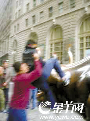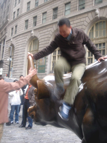 中國日報(bào)網(wǎng)環(huán)球在線消息:北京電視臺(tái)主持人王芳最近到紐約旅游,在華爾街偶遇一群內(nèi)地游客,在著名公牛銅雕塑前做出種種不文明的舉動(dòng),令老外搖頭圍觀看熱鬧,有些則繞道而行。王芳拍下此“奇觀”后張貼到其博客上,再次引來有關(guān)內(nèi)地游客素質(zhì)問題的討論。