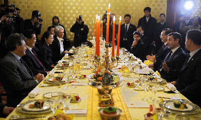 中國國家主席胡錦濤昨晚(11月25日)在釣魚臺國賓館特意以法式大餐招待來訪的法國總統(tǒng)薩科齊,賓主雙方相談甚歡。與正式會談時雙方領(lǐng)導人和各自官員分坐同一邊的嚴肅不同,昨天的宴會氣氛很輕松,雙方代表混坐在一起,胡錦濤的右側(cè)就是法國環(huán)境部長路易斯·波盧,而薩科齊的右側(cè)則坐著中國國務委員唐家璇。