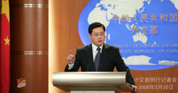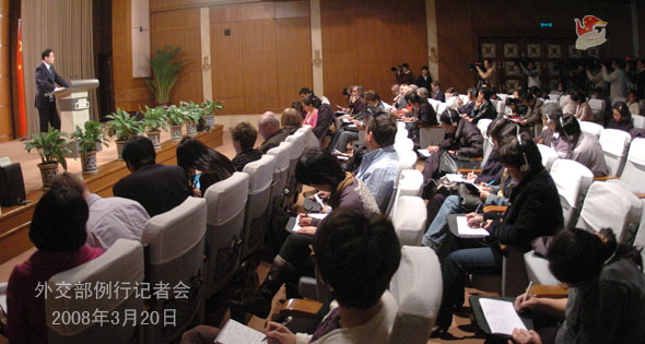 2008年3月20日下午,外交部發(fā)言人秦剛舉行例行記者會,就近期拉薩發(fā)生的打砸搶燒嚴(yán)重暴力犯罪事件等問題答問。