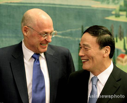 中國日報網(wǎng)環(huán)球在線消息:中國國家主席胡錦濤特別代表、國務(wù)院副總理王岐山4月2日上午與美國總統(tǒng)布什特別代表、財政部長保爾森舉行了會談。