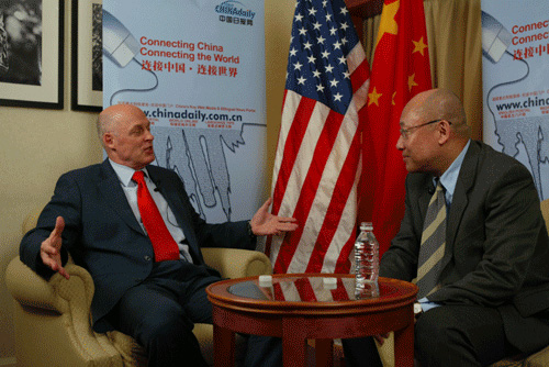中國日報網(wǎng)環(huán)球在線消息:4月3日,正在中國訪問的美國財政部長保爾森(左)在北京接受中國日報高級顧問Ed Zhang專訪。(信蓮)