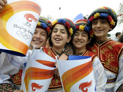 4月3日,身著民族服飾的伊斯坦布爾兒童等待觀看圣火傳遞。當(dāng)日,北京奧運(yùn)會圣火傳遞活動將在土耳其伊斯坦布爾進(jìn)行,這是北京奧運(yùn)圣火境外傳遞第二站。[新華社圖片]