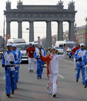 4月5日,火炬手、奧運(yùn)會田徑冠軍卡贊金娜手持火炬?zhèn)鬟f。當(dāng)日,北京奧運(yùn)會圣火傳遞活動在俄羅斯圣彼得堡舉行,這是北京奧運(yùn)會圣火境外傳遞第三站。[新華社圖片]