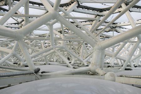 1月28日,作為北京奧運會標(biāo)志性場館的國家游泳中心(“水立方”)宣布竣工,即將投入“好運北京”賽事使用。這個歷時4年多時間建成的水藍(lán)色建筑,在中國國內(nèi)首次采用ETFE氣枕結(jié)構(gòu),也是世界上建筑面積最大、功能要求最復(fù)雜的膜結(jié)構(gòu)系統(tǒng)。圖為水立方的外部。