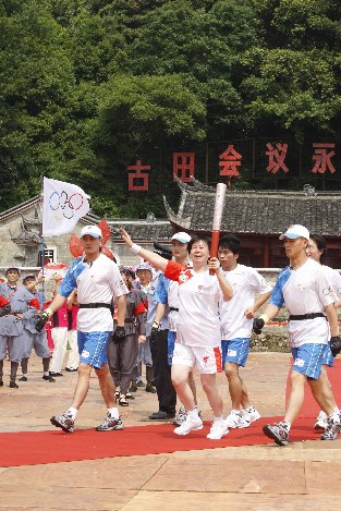 中國日報網(wǎng)環(huán)球在線消息:2008年5月13日下午2點, 奧運圣火在古田會議舊址點燃。下午第一棒即龍巖站傳遞第142棒火炬手郭金蘭手持火炬開始了在古田會址的傳遞活動。