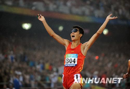 9月9日,中國選手張振在沖過終點后慶祝。當日,在國家體育場進行的北京2008年殘奧會男子5000米T11級決賽中,張振以15分27秒35的成績奪冠。新華社記者李尕攝