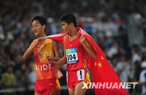 9月9日,中國選手張振(右)與領跑員在比賽后慶祝。當日,在國家體育場進行的北京2008年殘奧會男子5000米T11級決賽中,張振以15分27秒35的成績奪冠。新華社記者李尕攝