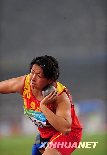 9月9日,中國(guó)選手鄭寶珠在比賽中。當(dāng)日,在國(guó)家體育場(chǎng)進(jìn)行的北京2008年殘奧會(huì)女子鉛球F42-46級(jí)決賽中,鄭寶珠以10米06的成績(jī)奪冠。新華社記者李尕?cái)z