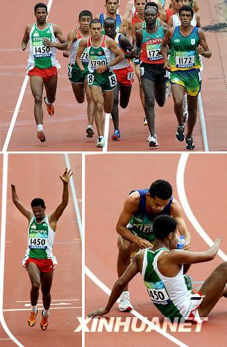 9月13日,在國家體育場“鳥巢”舉行的男子5000米T46級決賽中,埃塞俄比亞選手赫布在體力不支的情況下,堅持跑完全程后,席地而倒,巴西選手塞納連忙將其扶起并遞上清水。 新華社記者陶明攝