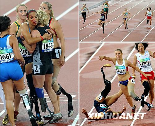 9月9日,在女子200米T44級的決賽中,世界紀錄保持者、美國名將霍姆斯以較大的優(yōu)勢一路領先,還剩30米時,她摔倒并絆倒了旁邊的法國選手菲爾。沖過終點后菲爾和其他選手一起跑到霍姆斯身邊,安慰霍姆斯并獻上熱情的擁抱。新華社記者陶明攝