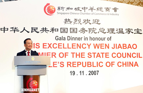 11月19日,國務(wù)院總理溫家寶出席新加坡中華總商會(huì)舉行的工商界人士晚餐會(huì)并致辭。