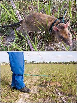 在嗅雷鼠訓(xùn)練中心,研究人員已經(jīng)成功訓(xùn)練出一批探測地雷的“高手”。訓(xùn)練中心工作人員每天下午訓(xùn)練老鼠,訓(xùn)練場地是一塊塊面積100平方米的正方形區(qū)域,研究人員在這些區(qū)域中埋放了數(shù)顆地雷。