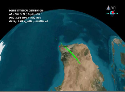 衛(wèi)星被導彈摧毀后,碎片(綠色)將繼續(xù)繞地球飛行,并在進入大氣層時燃燒殆盡(紅色)。