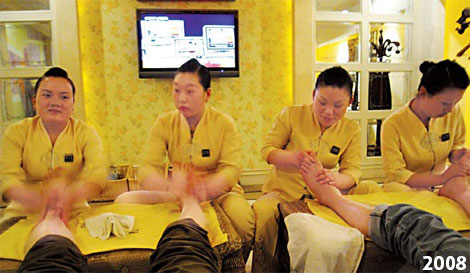 直到21世紀(jì)初,美容按摩的另一個延伸行業(yè)蔚然興起,這就是足療服務(wù)。足療店在中產(chǎn)階級的住宅區(qū)和高級寫字樓周圍隨處可見。這也就有了我們這張彩色照片上的足療師。一次服務(wù)一般持續(xù)一個小時(有的可以選擇半小時),通常需要100元左右。這再也不像80年代的路邊理發(fā)業(yè)只是一個追求實用的行業(yè),足療服務(wù)純粹是為了放松和休閑。