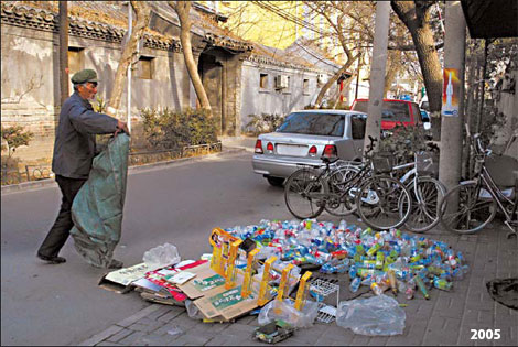 胡同里的人們不僅要收拾和打掃周圍環(huán)境,而且開始投身到各種文明競(jìng)賽之中,如保護(hù)古建筑和古樹。有一個(gè)貌似很小其實(shí)很深刻的變化就是回收廢品的習(xí)慣,這也是我們這張彩照的主題。住在胡同里的人已經(jīng)開始有條理地收集和重復(fù)利用生活廢品,如舊紙張、舊塑料和廢金屬,這部分得益于他們鄰里之間的密切聯(lián)系。一些老胡同的居民在環(huán)境保護(hù)方面要比郊區(qū)中等收入居民更超前,可能比很多工廠都做得更細(xì)致。