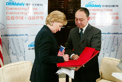 中國日報新聞中心主任孫尚武(右)向希拉里介紹《中國日報》